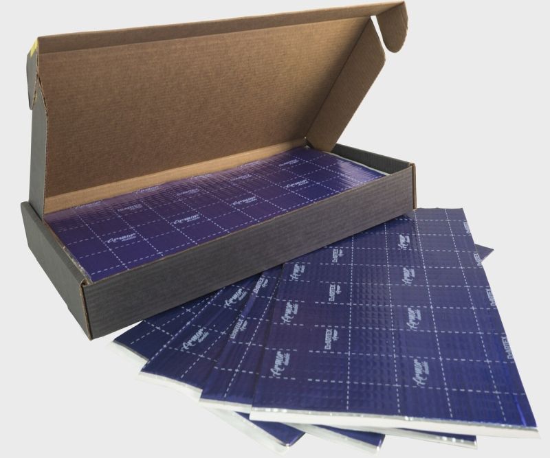 Materialul include două straturi de polimer butilic, **două folii de aluminiu temperate** de 100 µm și un strat adeziv performant. Datorită acestei compoziții, este ideal pentru zone unde rigidizarea este esențială: portbagaj, podea, arcade, perete despărțitor și proiecte high-end.